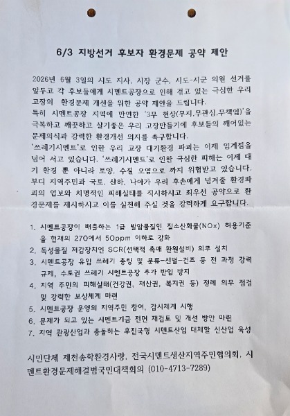오는 6월 3일 지방선거를 앞두고 시멘트 공장 인근 주민들과 환경단체들이 여·야 출마 후보자들에게 강력한 환경 개선 공약을 촉구했다.