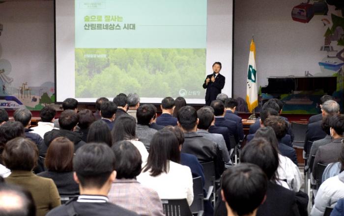 ▲ 남성현 산림청장 특강제천시는 2일 오전 9시 제천시청 5층 청풍호실에서 남성현 산림청장을 초청해 ‘숲으로 잘 사는 산림르네상스 시대’라는 주 제로 특강을 개최했다.이날 특강에는 제천산림조합, 우수독림가, 제천 생명의 숲 등 산림관계자와 제천시 공무원 총 200여명이