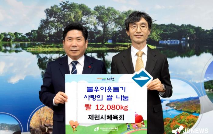 ▲ 제천시체육회장 사랑의 쌀나눔 기탁식안성국 민선 2기 제천시 체육회장은 제천시 체육회장 이·취임식의 축하 쌀화환 995포(12,080kg)를 경로당 어르신들을 위해 써달라며 제천시에 기탁했다. 지난 2월 17일 민선 2기 제천시 체육회장으로 취임한 안성국 회장은 지