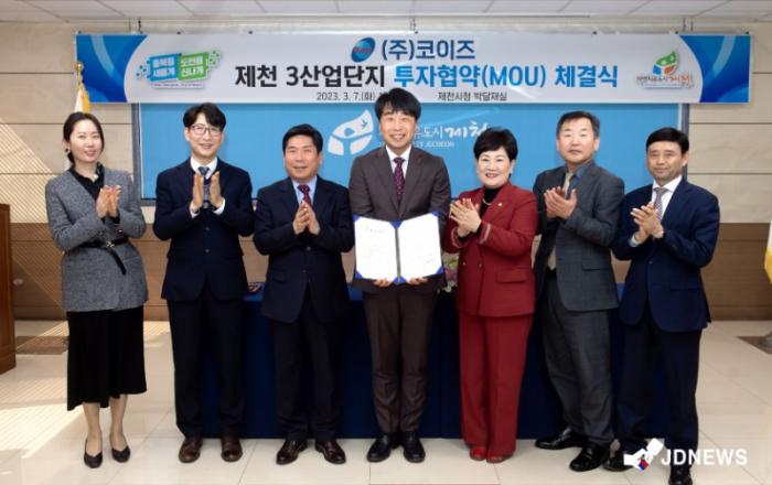▲ 제천시-코이즈 투자협약식 제천시는 7일 이차전지 소재기업인 ㈜코이즈(대표이사 조재형)와 기업 신설 투자협약을 체결한다.김창규 제천시장, 이정임 제천시의회 의장, ㈜코이즈 조재형 대표이사 등 8여명의 관계자가 참석한 가운데 투자협약을 체결했다.이번 협약으로