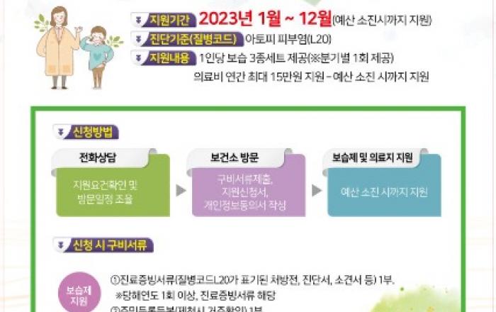 ▲ 아토피 지원 홍보포스터제천시는 아토피피부염(질병코드 L20)을 진단받은 제천시민에게 보습제 및 의료비를 예산 소진 시까지 지원한다. 아토피피부염은 재발이 잦은 만성 피부질환으로 보통 유아기에 발생하여 잘 관리되지 못하면 성인기까지 이어질 수 있어, 체계적인 치료