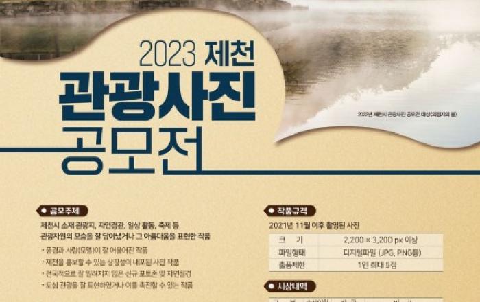 ▲ 2023 관광사진 공모전 포스터제천시가 오는 10월 31일까지 지역 관광지의 효율적 홍보와 컨텐츠 강화를 위해 ‘2023 제천 관광사진 공모전’을 개최한다. (사)제천시관광협의회 주최로 펼쳐지는 이번 사진전은 제천시 소재 관광지를 대상으로 자연경관, 일상 활동,