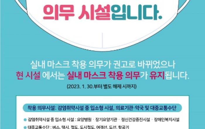 ▲마스크 권고 전환 홍보 포스터제천시는 실내 마스크 착용 의무가 해지되고‘착용 권고’로 전환됐다고 6일 밝혔다. ▲코로나19 의심 증상이 있거나 증상 의심자와 접촉한 경우, ▲코로나19 고위험군 또는 고위험군과 접촉한 경우, ▲최근 코로나19 확진자와 접촉했던 경우(