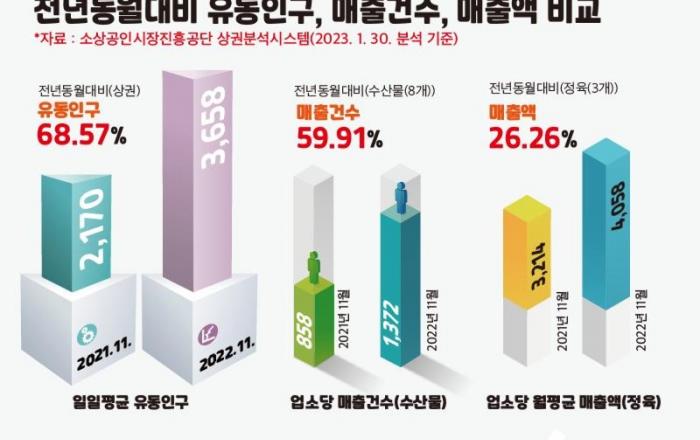 ▲ 내토전통시장 문화관광형시장 육성사업 통계자료제천시가 지난 10일 작년 소상공인시장진흥공단 상권분석시스템 통계 분석 결과를 발표했다.이 통계자료에 따르면 작년 기준 내토전통시장 내 유동인구 68.57%가, 매출건수 수산물(8종) 59.91%, 정육(3종) 26.26%