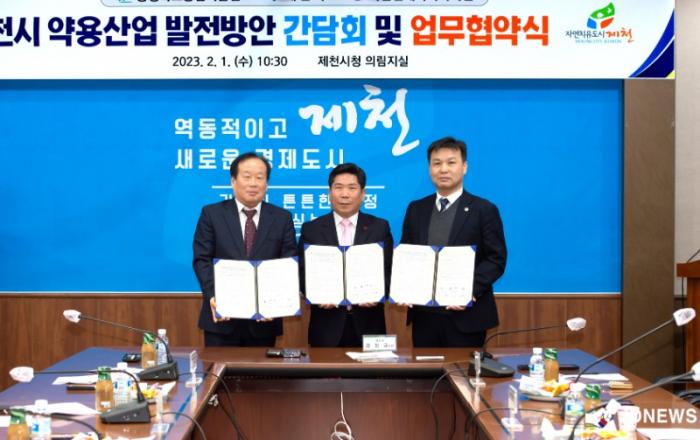 ▲ 약용산업 발전방향 업무협약식 제천시(시장 김창규), 농촌진흥청 국립원예특작과학원(원장 이지원), 충청북도농업기술원(원장 서형호), 3개 기관은 2월 1일 제천시청에서 ‘제천시 약용산업 발전 방안 마련을 위한 다자 간 업무협약’을 체결했다. 이번 행사는 충