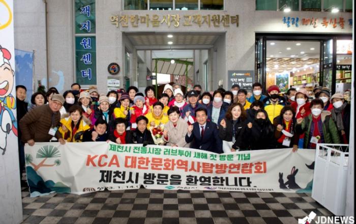 ▲ 러브투어 첫 단체 방문 환영식 제천시는 지난 14일 역전한마음시장에서 2023년 계묘년 새해 첫 번째 전통시장 러브투어 방문객 환영식을 했다. 이 날 2023 러브투어 관광객 1호의 행운은 80명의 회원과 함께 제천을 방문한 KCA 대한문화역사탐방연합회 강