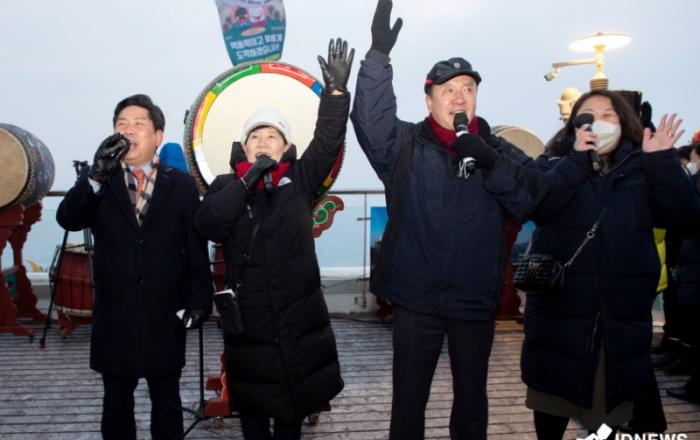 ▲2023 해맞이행사(시장 시의장 국회의원)제천시는 2023 새해 첫날 비봉산 정상에서 김창규 시장을 비롯해 이정임 의장, 엄태영 국회의원, 시민 등 400여명이 참석한 가운데 청풍호반 케이블카 일원에서 ‘2023년 새해맞이 시민화합 해맞이 행사’를 개최했다. 이날