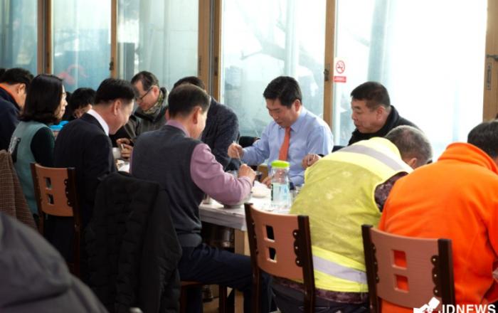 ▲ 2023 환경미화원들과 첫 오찬간담회 전경 제천시는 새해를 맞이해 김창규 제천시장이 첫 오찬으로 환경미화원 및 운전원 70여명과 오찬간담회를 가졌다고 3일 밝혔다. 지난 2일 진행한 이번 간담회에서 김 시장은 미화원들과 떡만둣국을 함께 나누며, 매일 새벽
