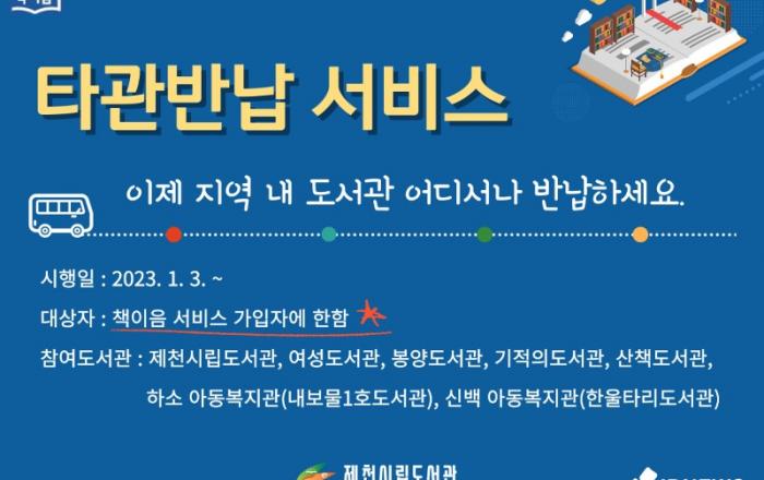 ▲ 타관반납 서비스 시행 홍보제천시는 최근 책이음 서비스 가입자에 한해 지역 내 7개 도서관 중 어디에서나 반납할 수 있는 ‘타관 반납 서비스’를 실시한다고 5일 밝혔다.사업 시행 전에는 무조건 대출한 도서관에서만 반납하도록 되어있어, 필요한 책이 한곳에 없는 경우 여