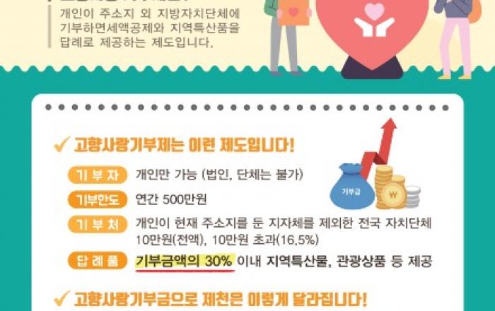 ▲ 제천시 고향사랑 기부제 홍보 포스터제천시는 지난 21일 제천시청에서‘제2차 고향사랑 기부제 답례품 선정위원회’를 열고 답례품을 선정했다. 내년 1월 1일부터 전국 각지에서 시행되는 이 제도는 현재 주소를 둔 지자체를 제외한 전국 자치단체에 개인만 500만원까지
