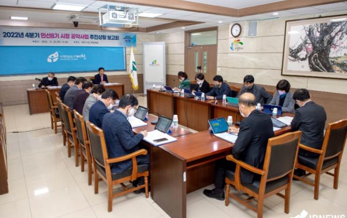 ▲ 제천시 민선8기 공약사업 추진보고회 제천시는 지난 22일 제천시청 청풍호실에서 김창규 제천시장 주재로 ‘민선8기 시장 공약사업 추진상황 보고회’를 개최했다.이날 보고회는 공약사업 담당 부서장이 참석한 가운데 그간 공약사업 추진실적 및 내년 추진계획과 문제점 등을 점