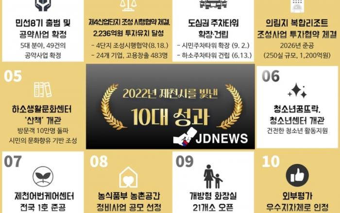 ▲ 2022년 제천시 10대 성과제천시가 코로나19와 경제위축에도 불구하고 ‘역동적이고 새로운 경제도시 제천’실현을 목표로 추진한 사업 가운데 10대 성과를 28일 발표했다. 10대 성과로 ▲민선8기 출범 및 공약사업 확정, ▲제4산업단지 조성 시행협약 체결과 2,2