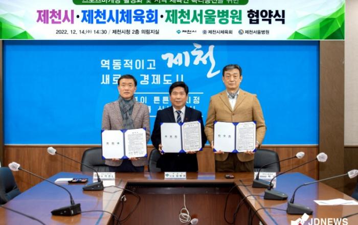 ▲ 제천시-체육회-서울병원 협약식제천시는 14일 제천시체육회, 제천서울병원과 제천시청에서 스포츠마케팅 활성화 및 지역 체육인 복리증진을 위한 협약식을 가졌다. 이 날 협약식은 김창규 제천시장, 이강윤 제천시체육회장, 박건 제천서울병원행정원장이 참석한 가운데, 체육인