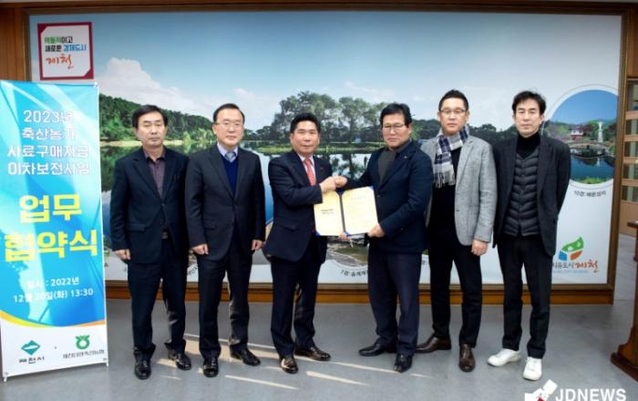 ▲ 사료구매자금 지원 업무협약 체결식 제천시와 제천단양축산업협동조합(조합장 유도식)은 20일 관내 소재 축산농가에 사료구매자금 대출 이자 차액을 지원하는 업무협약을 체결하였다. 이번 협약으로 제천시 소재 축산농가는 사료 구매 목적으로 자금 대출
