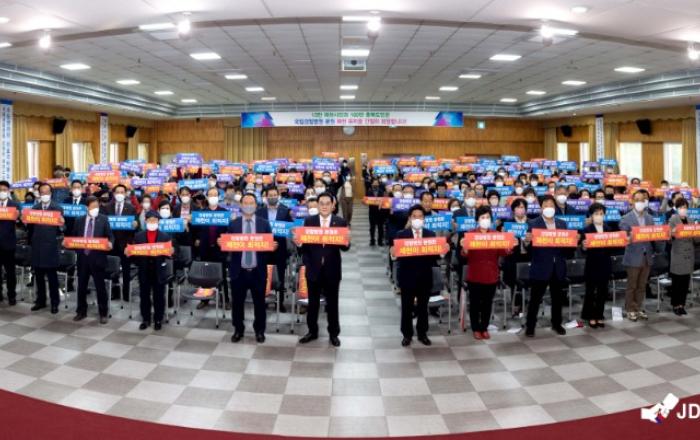 ▲ 경찰병원 분원 제천유치를 위한 범시민대회 단체사진제천시와 국립 경찰병원 분원 제천 유치 범시민추진위원회(위원장 최명현, 이하 ‘추진위’)는 10일 제천시청에서 ‘국립 경찰병원 분원 제천유치를 위한 범시민결의대회’를 개최했다.300명이 훌쩍 넘는 시민들이 운집해 분원