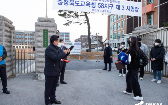 ▲제천시 2023 수능생 응원 (제천여자고등학교)17일, 2023학년도 대학수학능력시험이 요란한 응원이 사라진 가운데 대부분 차분한 분위기 속에 입실이 진행됐다.제천시의회 의원들은 수능시험장이 마련된 제천여고, 제천고등학교 등을 돌며 수험생을 응원하며 힘을 북돋았고,
