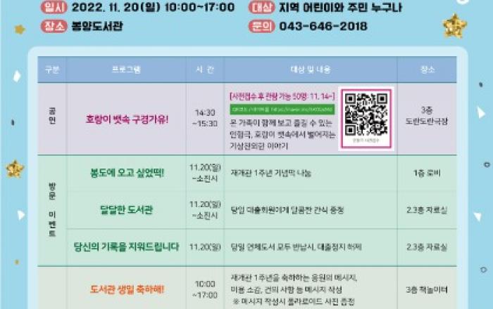 ▲ 봉도 첫돌 포스터 제천봉양도서관(관장 박상천)은 오는 20일 재개관 1주년을 맞이해 봉양도서관 일원에서‘봉도 첫돌’특별행사를 진행한다. 제천시민이면 누구나 참여가 가능한 이번 행사는 각종 체험행사, 인형극 공연, 방문이벤트 등이 다채롭게 펼쳐질 예정으로