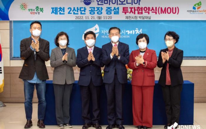 ▲엔바이오니아 투자협약식 제천시는 지난 21일 제천시청에서 ㈜엔바이오니아(대표 한정철)와 840억원의 제천 2산단 공장 증설 투자협약을 체결했다. 김창규 제천시장, 이정임 제천시의회 의장, ㈜엔바이오니아 대표이사 등 10여명이 참석한 가운데 진행된 이번 투자협약식으로