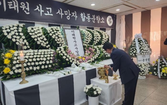 ▲ 제천시 충북도 합동분향소 조문 제천시는 2일 김창규 제천시장이 충북도청에 설치된 이태원 사고 희생자 합동분향소를 찾아 조문했다고 밝혔다. 이번 방문은 김창규 제천시장 외 간부공무원, 이정임 제천시의회 의장 등 관계자 10명이 함께 뜻을 모아 조문하는 것으