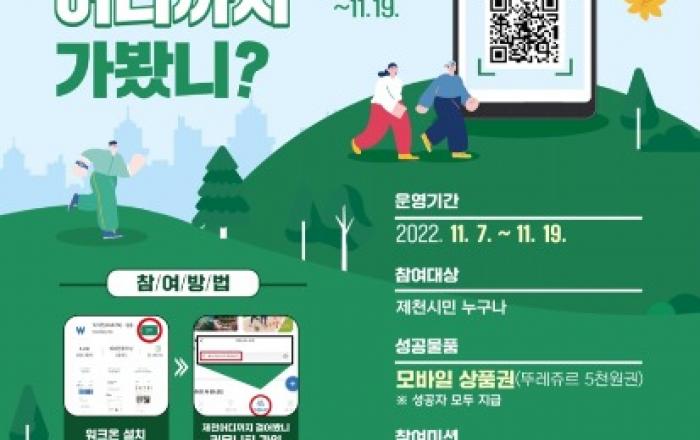 ▲ 11월 걷기 스탬프 챌린지 홍보포스터 제천시보건소(소장 유재숙)는 오는 19일까지 관내 일원에서 ‘11월 걷기 스탬프 챌린지’를 진행한다. 참여는 ‘워크온’ 어플 설치 후 ‘제천 어디까지 걸어봤니?’ 커뮤니티에 가입하고, 챌린지 탭에서 해당 챌린지 ‘참여하기’를