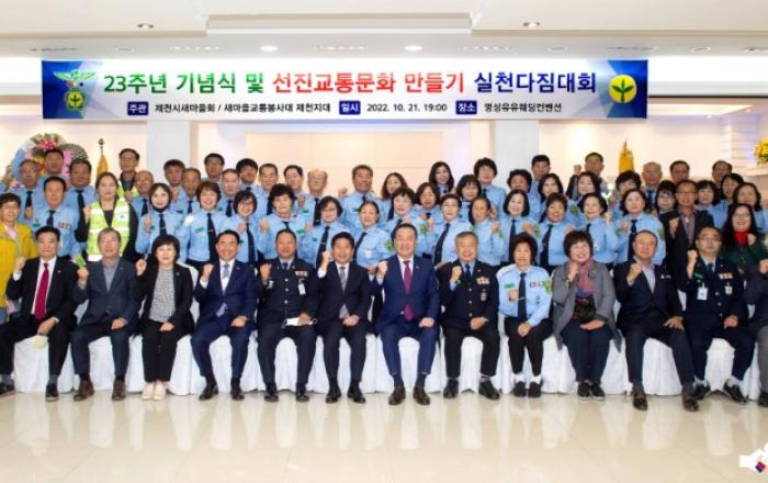 ▲새마을교통봉사대 제천지대 23주년 기념식 개최새마을교통봉사대 제천지대(대장 이용진)는 지난 21일 명성유유컨벤션에서 ‘창립 23주년 기념식 및 교통안전지킴이 다짐대회’를 개최했다. 이날 행사는 새마을교통봉사대 중앙대 강기자 대장과 임원진을 비롯해 제천시새마을회 이동