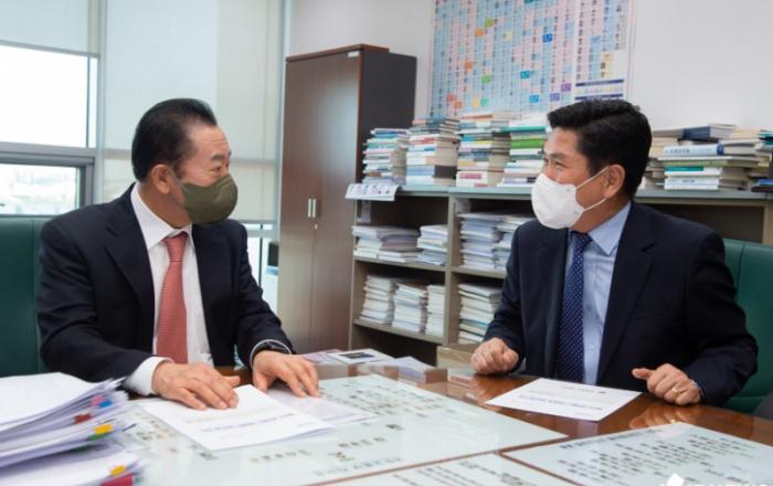 ▲김창규 시장 국회의원 방문해 정부예산 증액 요청지난 25일 김창규 제천시장은 내년도 정부예산 국회심의에 앞서 국회의원을 면담하고 제천시 주요 사업에 대해 증액을 건의하였다. 김창규 제천시장은 이날 엄태영(충북 제천·단양, 산통위) 의원과 박대수(비례, 환노위) 의원