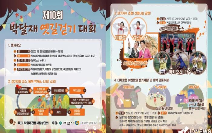▲ 제10회 박달재 옛길걷기 행사 박달재 전통시장상인회(회장 노용진)는 오는 29일 10시 박달재 전통시장 일원에서 ‘제10회 박달재 옛길 걷기대회’를 개최한다. 이 날 행사는 힘찬 농악대의 선두를 시작으로 박달재 전통시장에서 자연휴양림을 지나 박달재 정상까지 왕복