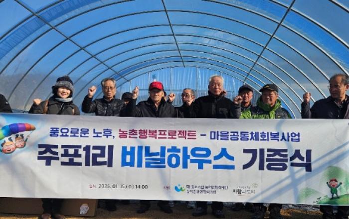 주포1리 소형 비닐하우스 기증식사람과도시 사회적협동조합은 지난 15일 봉양읍 주포1리에 소형 비닐하우스 1동을 완공하고 기증식을 가졌다.이번 사업은 마을 공동체 회복을 목적으로 관내 읍면에서 10개 마을을 선정해 비닐하우스 설치나 마을을 상징하는 나무 식재를
