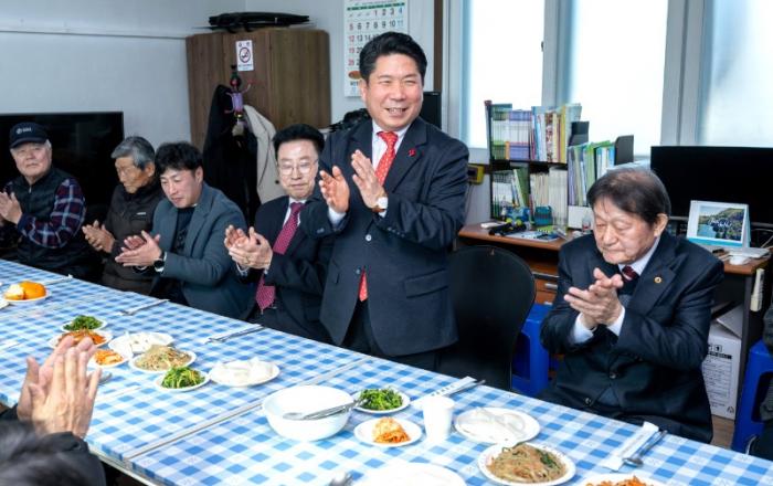 당모루경로당 점심 시간 지난 10일 김창규시장이 시천 신년하례행사 후 당모루 경로당을 찾아 인사를 하며 제천형’경로당 점심제공지원사업의 도약을 설명했다. 제천시에서 민선8기 공약사업으로 추진하고 있는 ‘제천형’경로당 점심제공지원사업이 2025년 사업추진 3년 차를