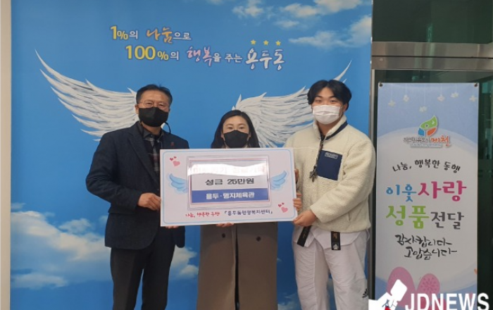 충북 제천 용두명지 체육관 학생들이 연말을 맞아 뜻 깊은 바자회를 열고 수익금 전액을 용두동행정복지센터에 30일 기탁했다.이번 바자회로 얻은 수익금은 각각 다른 유·초·중·고등학생들이 모여 본인들이 사용한 물품이나 새물품들을 기부형식으로 모아 바자회를 열고 수익금 25