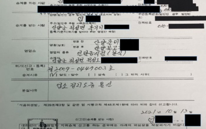 ▲ 한국외식업중앙회 단양지부가 식품영업자 지위승계 신고서를 업주 동의도 없이 조작해 군청 위생과에 제출한 사실이 알려져 논란이 일고 있다.충북 단양군 한국외식업중앙회 단양지부(이하 단양지부)가 식당업주의 동의도 없이 신분증과 도장을 도용해 음식점 영업 양도 양수 승계