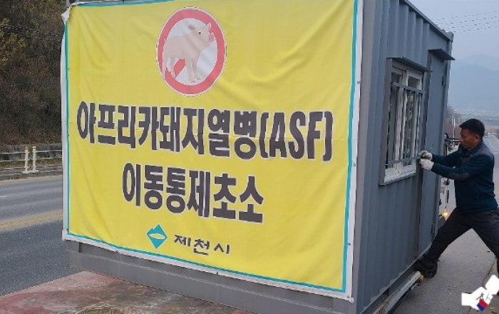 ▲ 제천시 아프리카돼지열병(ASF) 이동통제초소 모습충북 제천시는 지난 19일 충북 북부권역에서 최초 발생한 야생멧돼지 아프리카돼지열병(ASF)이 송학·백운면에서 발생하는 등 확산 조짐을 보이는 가운데 지역내 양돈농가로의 유입을 막기 위해 모든 행정력을 동원한 총력 대