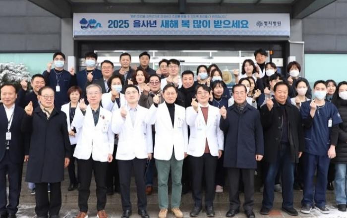 제천명지병원 2025년 시무식 후 기념 사진제천명지병원은 6일 본관 로비에서 2025년 시무식을 열고 희망찬 새해의 시작을 알렸다. 이날 행사에는 병원 임직원과 보훈단체 관계자들이 참석해 지난 한 해의 성과를 돌아보고, 새해 목표와 비전을 공유하며 뜻깊은 시간을 가졌다