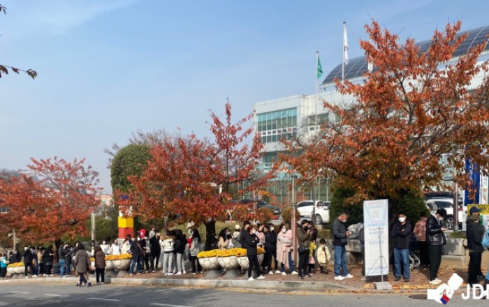 ▲ 제천시보건소입구부터 선별진료소까지 검체검사 대기자들이 줄지어 서있다.JD News 유소진 기자 = 충북 제천시가 지역내 학생들 중심으로 신종 코로나바이러스 감염증(코로나19)이 잇따라 발생하면서 지난해 김장모임발 연쇄감염사태가 되풀이될까 지역사회가 초긴장 상태에 있