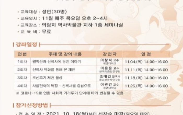 ▲ 11월 성인대상 교육프로그램인 제3회 역사문화강좌 포스터JD News 유소진 기자 = 충북 제천시 의림지 역사박물관은 오는 11월부터 성인대상 교육프로그램인 제3회 역사문화강좌를 개최한다고 28일 밝혔다. 월악산 기슭에 자리한 제천 신륵사 극락전의 벽화를 조명