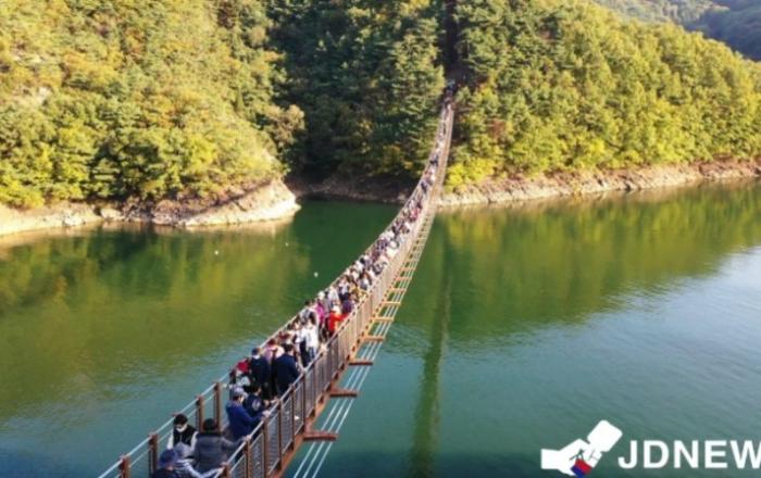 ▲ 지난 22일에 개장한 제천시 옥순봉 출렁다리가 주말을 맞아 방문객들로 인산인해를 이루고 있다.JD News 유소진 기자 = 충북 제천시 옥순봉 출렁다리가 지난 22일 개장 이후 주말이면 인근 도로가 마비 될 정도로 많은 인파가 몰리면서 새로운 관광명소로 부상하고 있