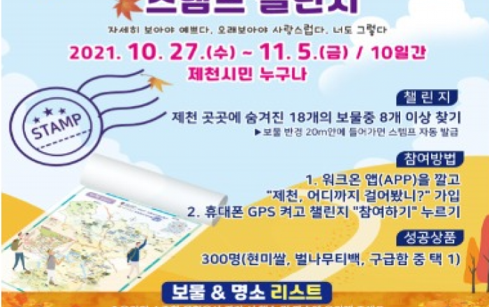 ▲ 제천 곳곳, 숨겨진 보물찾기 스템프 챌린지 포스터JD News 유소진 기자 = 충북 제천시 보건소에서는 2021 한방바이오박람회 개막에 맞춰 '제천 곳곳, 숨겨진 보물찾기' 스템프 챌린지를 실시한다. 오늘(27일)부터 11월 5일까지 10일간 진행되는