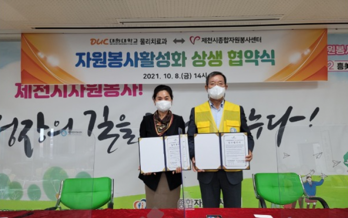▲ 제천시 종합자원봉사센터와 대원대학교 물리치료과가 지난 8일 지역사회복지증진과 자원봉사 발전 위한 업무 협약을 맺었다.JD News 유소진 기자 = 충북 제천시 종합자원봉사센터가 지난 8일 대원대학교 물리치료과 세끝만사 동아리와 지역사회복지증진 및 자원봉사 발전을 위