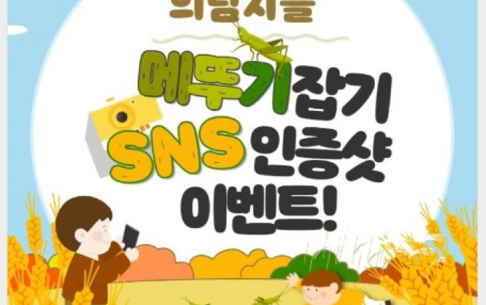 ▲ 제천시 친환경농업단지 의림지뜰 메뚜기잡기 SNS 인증샷 이벤트 포스터JD News 유소진 기자 = 충북 제천시는 친환경농업단지 의림지뜰 및 친환경 쌀 홍보를 위해 ‘메뚜기잡기 SNS 인증샷 이벤트’를 오늘(15일)부터 10월 24일까지 10일간 진행한다고 밝혔다.