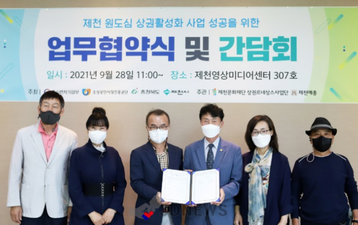 ▲ 제천문화재단 상권르네상스사업단과 제천예총이 업무협약을 체결했다. JD News 유소진 기자 = 제천문화재단 상권르네상스사업단과 한국예총 충청북도연합회 제천지회가 지난28일 제천문화재단에서 원도심 상권활성화 및 지역 문화·예술 발전을 위한 업무협약을 체결했다