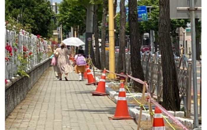▲ 의림초 앞 폭 3m인 인도에 1m의 화단조성으로 인해 통행의 불편과 아이들 등하교시 안전사고 우려에 학부모들의 반발이 이어지고 있다. (사진 유소진기자 2021.6.2)JD News 유소진 기자 = 제천시는 초등학교 주변 폭 좁은 인도에 어린이들을 위한 화단과 옹벽