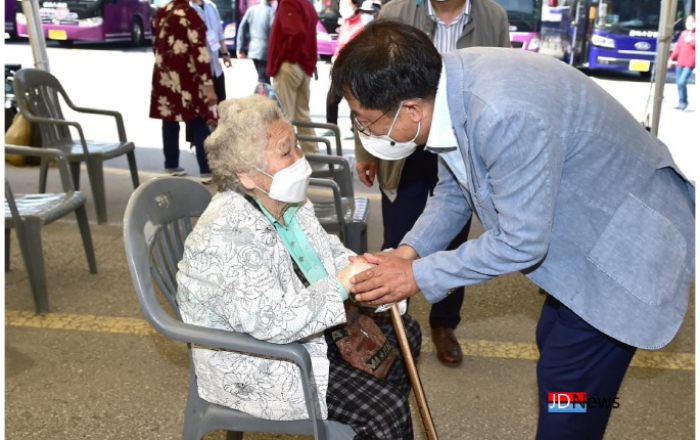 ▲ 이상천 제천시장이 2일 오전 제천체육관을 방문해 접종대상 어른신들과 의료진 등을 격려하며 오는 3일까지 대상자분들은 백신접종 예약하길 당부했다.JD News 유소진 기자 = 이상천 제천시장은 2일 오전 75세이상 어르신 신종 코로나바이러스 감염증(코로나19) 백신접