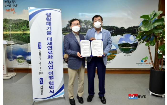 ▲ 제천시와 아세아시멘트가 생활폐기물 대체연료화 사업 이행 협약식을 체결했다.JD News 유소진 기자 = 제천시는 생활폐기물의 안정적 처리를 위해 아세아시멘트와 협업하여 생활폐기물 중 가연성 폐기물을 시멘트 생산의 대체연료로 공급하는 협약을 체결하고 자원순환 사회 구