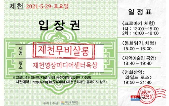 ▲ 제천문화재단에서 추진하는 '문화가 있는 날' 입장권 JD News 유소진 기자 = 제천문화재단(이사장 김연호)에 따르면 오는 29일 '2021년 문화가 있는 날' 지역특화프로그램으로 지역예술인과 함께하는 ‘제천무비살롱’을 개최 한다고 25일 밝혔다.제천문화