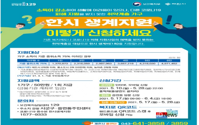 ▲ 제천시 한시생계지원금 안내문 JD News 유소진 기자 = 제천시는 신종 코로나바이러스 감염증(코로나19)로 인해 소득이 감소한 저소득 위기가구를 대상으로 제4차 재난지원 '한시생계지원금'을 지원한다고 11일 밝혔다. 지원대상은 올해 3월 1일 기준 가