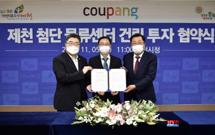 ▲ 쿠팡 제천첨단물류센터와 이상천 제천시장이 투자협약식을 맺었다.JD News 유소진 기자 = 제천시는 지난해 11월 투자협약을 맺고 진행 중인 쿠팡 제천첨단물류센터의 건립이 내년 초부터 본격적으로 추진된다고 12일 밝혔다. 쿠팡(주)은 제천 제3산업단지의 부지 1