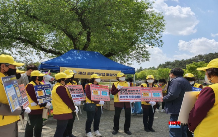 ▲ 지난 5일 제천시 의림지에서 공공배달앱 '배달모아' 대시민 홍보활동에 나섰다.JD News 유소진 기자 = 제천시가 지난 5일 어린이날을 맞아 많은 시민들이 찾은 의림지 일원에서 공공배달앱 ‘배달모아’ 대시민 홍보활동을 실시했다.배달모아는 제천시가 신종 코로나바이러