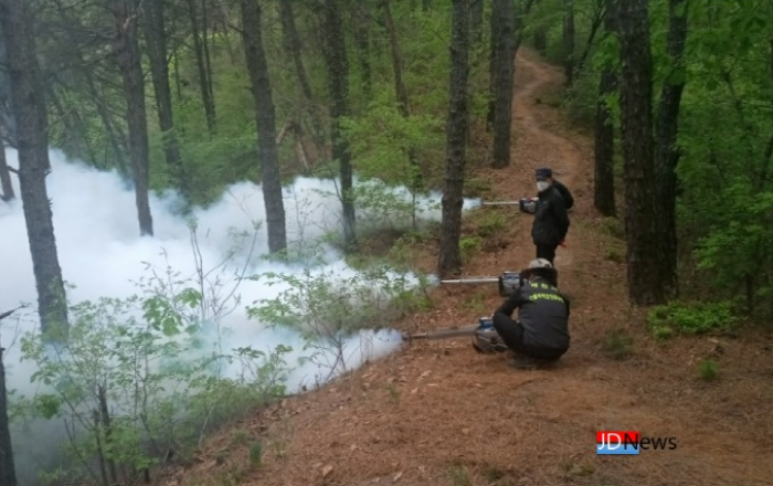 ▲ 매미나방(유충) 연막방제작업 모습JD News 유소진 기자 = 제천시는 매미나방(유충)피해 저감을 위해 총력 방제에 나섰다고 6일 밝혔다. 시는 지난달부터 알에서 부화한 매미나방 유충 방제를 위하여 산림병해충예찰방제단, 산불전문예방진화대 등 가용인력 8