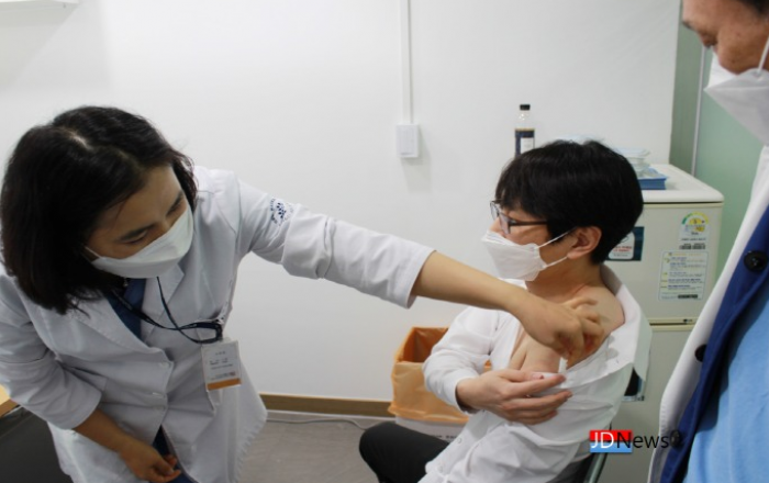 ▲ 제천명지병원 의료진 아스트라제네카 백신 접종하는 모습 JD News 유소진 기자 = 명지병원은 지난 4일 의료진 대상으로 아스트라제네카 신종코로나바이러스-19 백신 자체 접종을 실시했다.이번에 시행되는 1차 아스트라제네카 백신 접종 대상자는 모두 230명으로, 지난