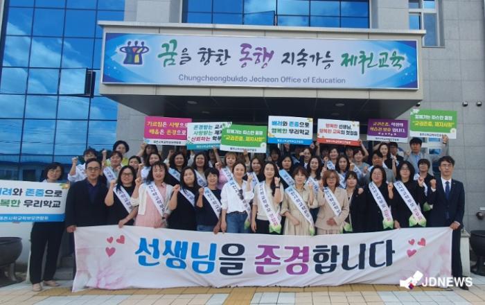 제천교육지원청 본관 건물 앞에서 선생님 존중 캠페인 실시했다.제천시학교학부모연합회(회장 서록희)는 5월 27일 제천교육지원청 본관 건물 앞에서 ‘선생님 존중 캠페인’을 실시했다.이 캠페인은 제천 관내 초, 중, 고, 특수학교 등 각급 학교 학부모회장의 자발적인 참여로
